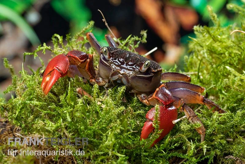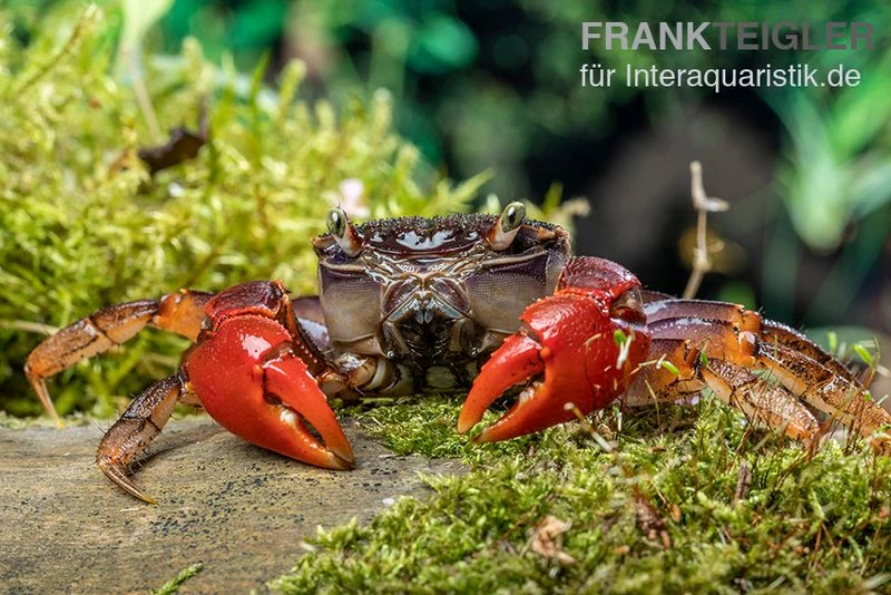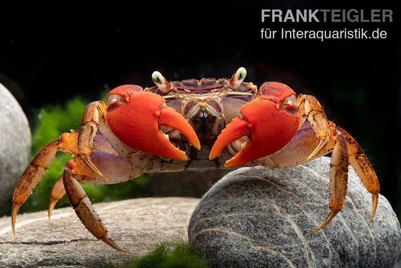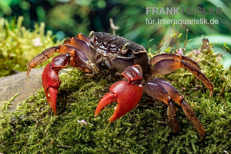 Neosarmatium cf. meinerti sind wunderschön anzusehen und attraktiv zu beobachten. Mit ihrer attraktiven Färbung sorgen die Süßwasserkrabben für die nötigen Farbtupfer im Becken. Für die artgerechte Haltung und Pflege von Spider Crab sp. Extreme Red empfiehlt sich ein Aquaterrarium mit einer Kantenlänge von ungefähr 80 cm. Der Wasseranteil sollte dabei 70 % betragen. Am integrierten Landteil sollte zum Wohle der Tiere eine Luftfeuchtigkeit zwischen 24 und 30 Grad Celsius vorherrschend sein.